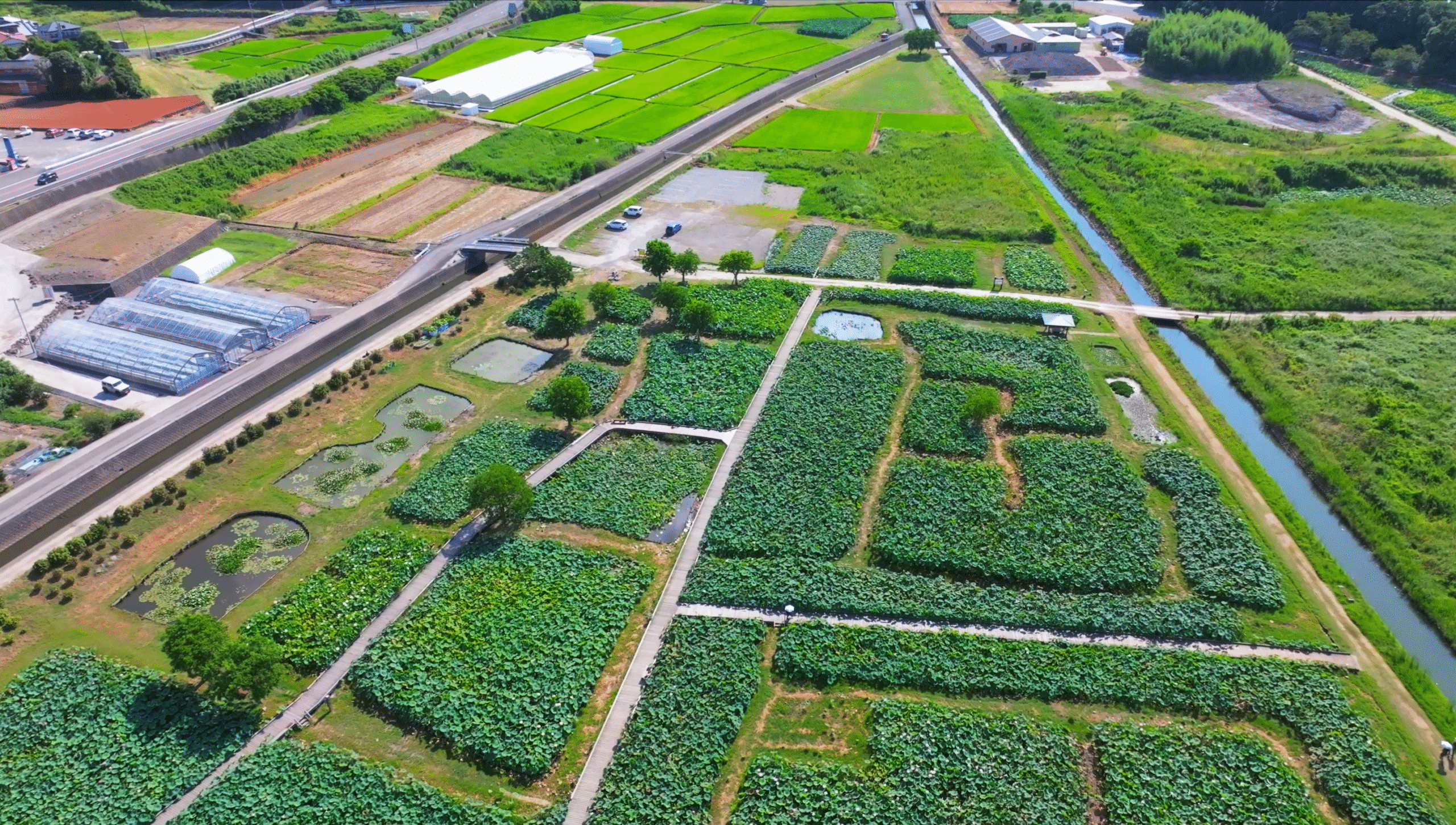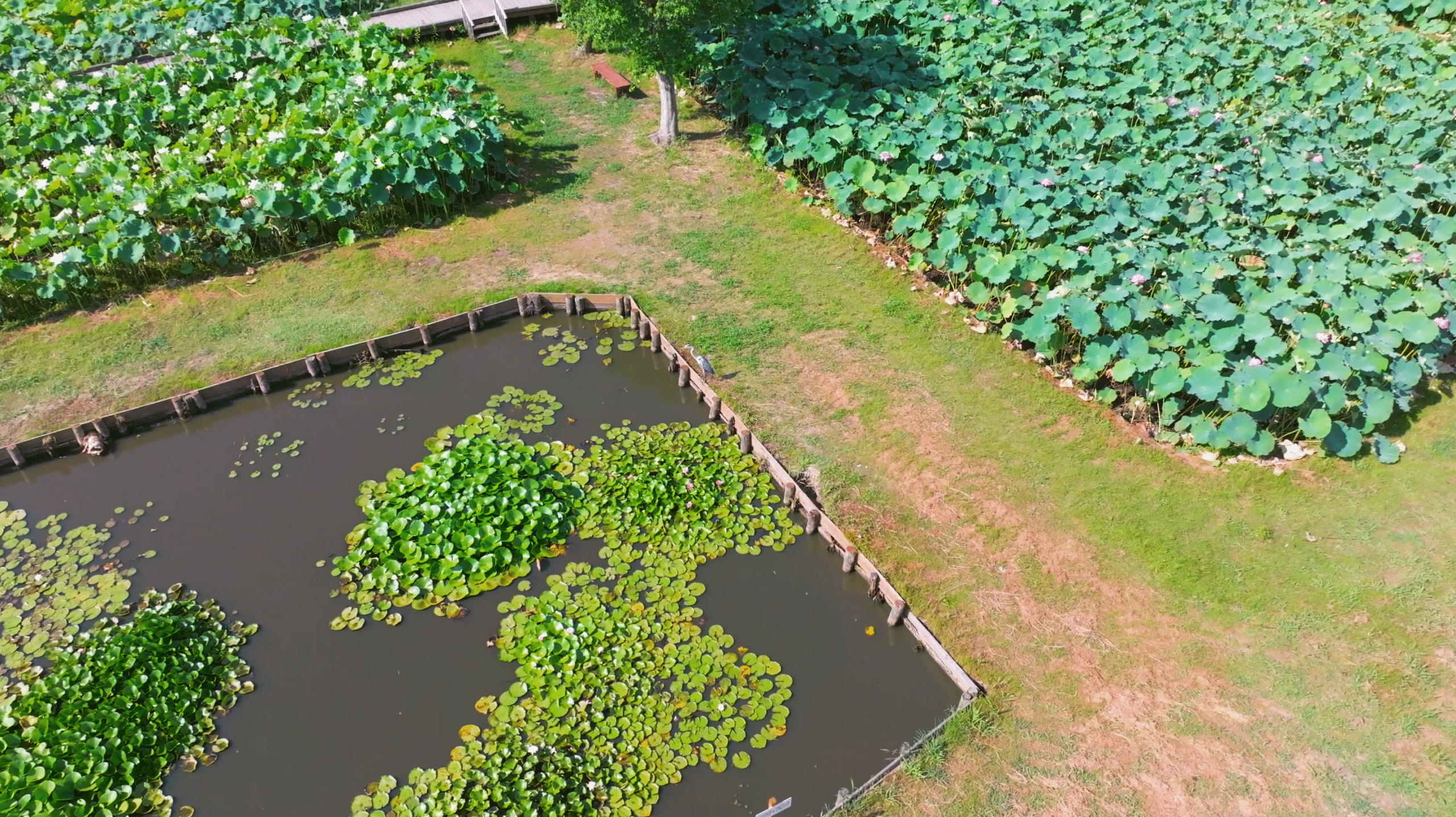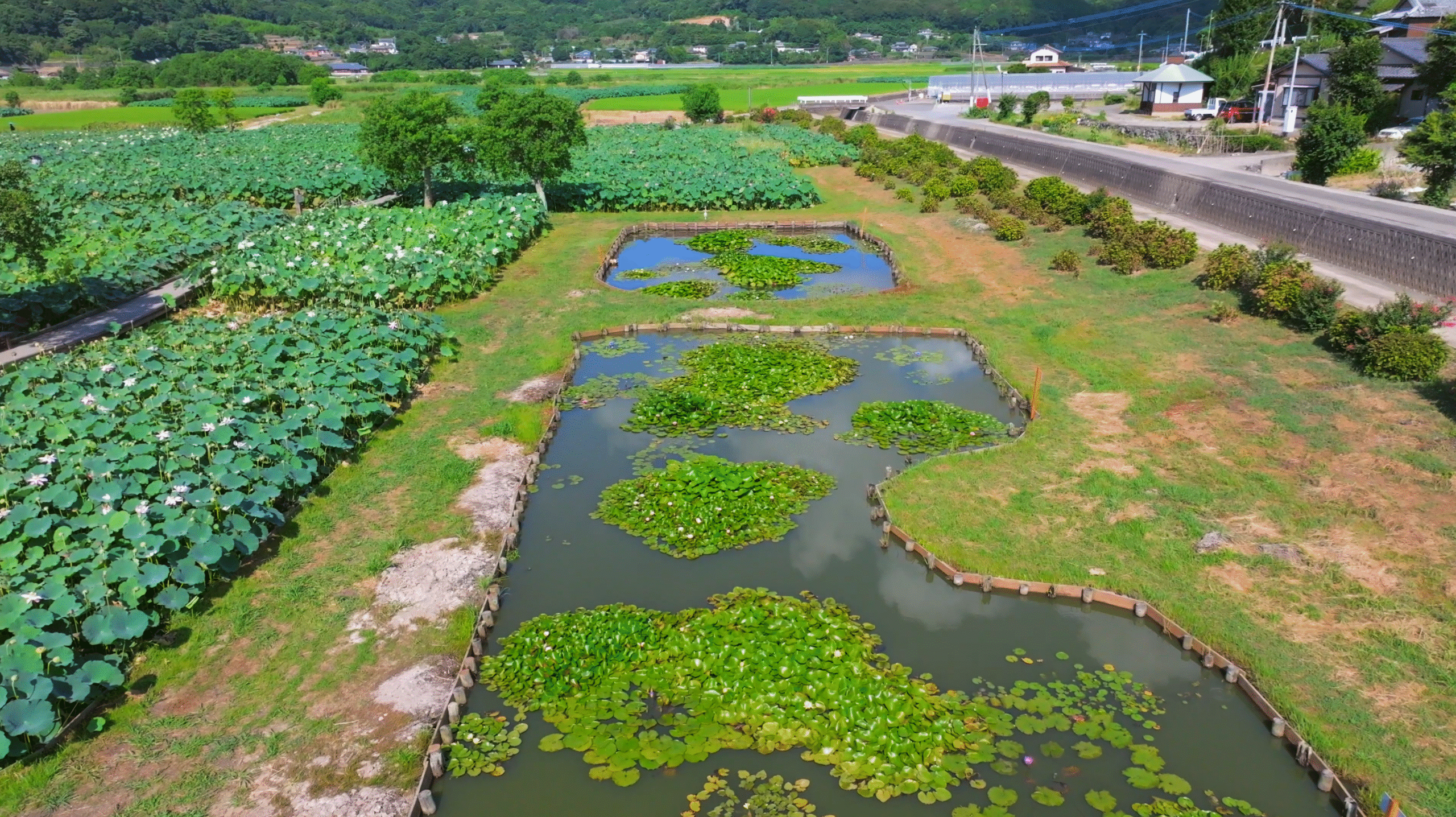 地上から見ても美しいハス園ですが、ドローンならではの上空からの視点で眺めるとさらにその魅力が際立ちます。