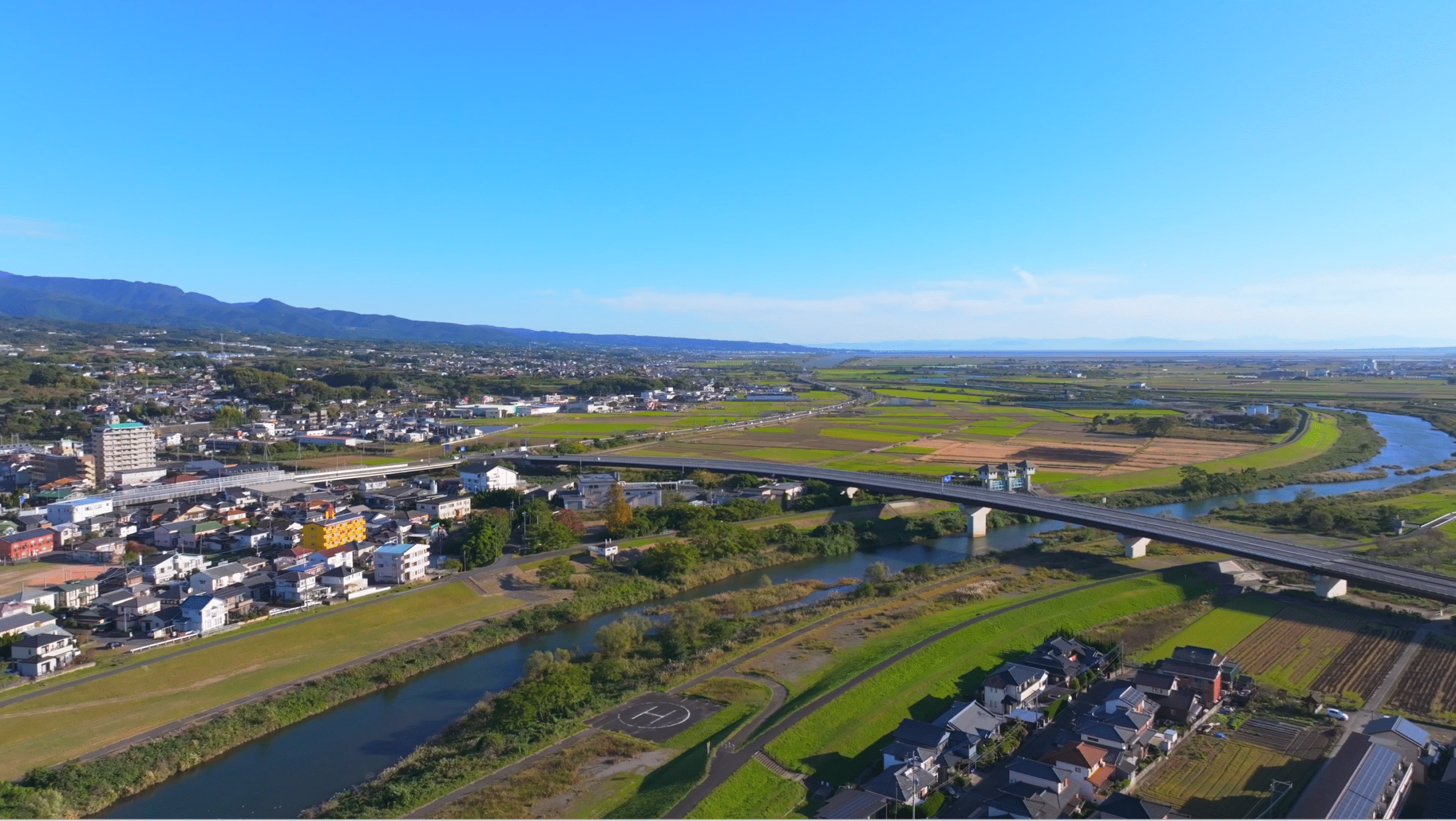隣の本明川も上空から川をゆっくり追っていくと、川岸のカーブや水面の光の反射がすごく美しい。