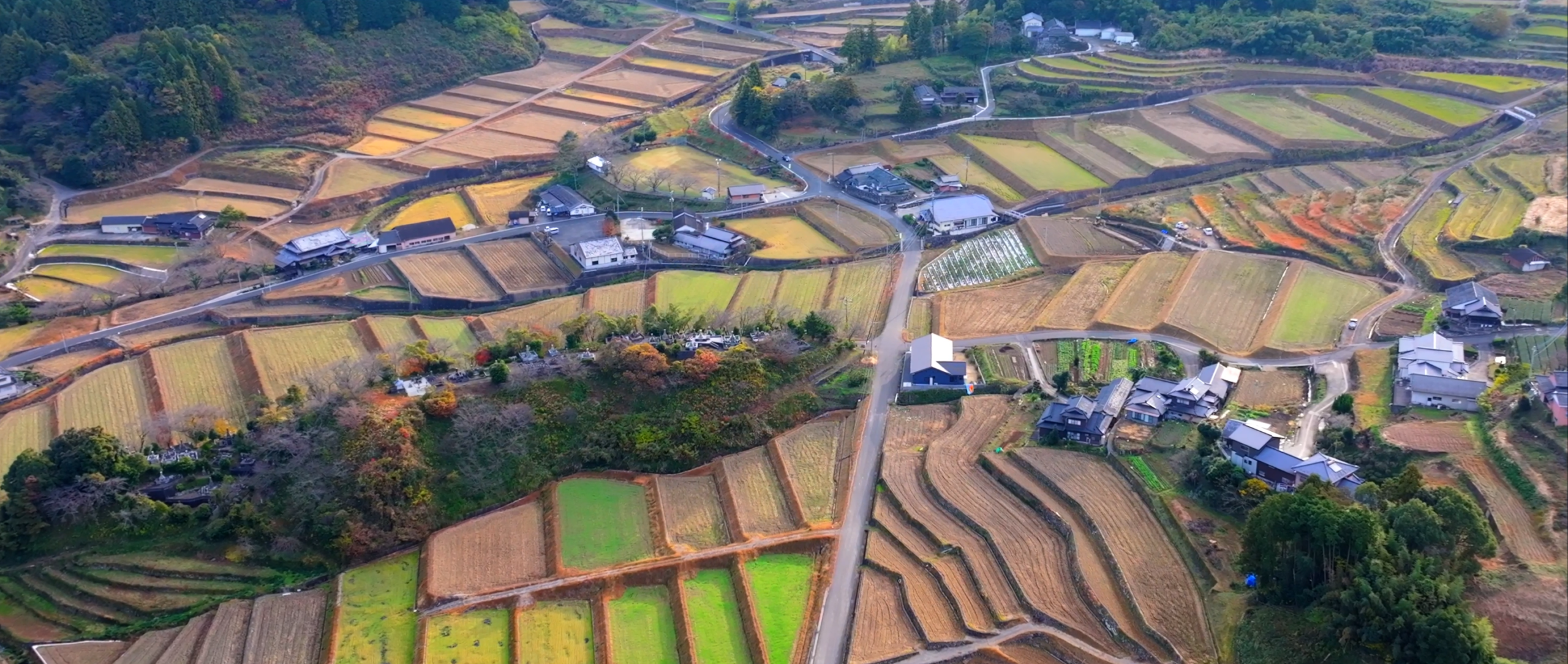 鬼木の棚田は、上空から見ると“時間の積み重なり”がすごくよく分かる場所で、段差ひとつひとつの形、畦の微妙なカーブ、区画ごとの色の違い、それぞれが、この土地を守ってきた人たちの手の跡で、その積み重ねが大きな模様になって見えてくる。