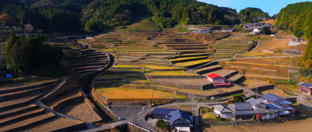 地上から見ても美しい棚田ですが、上空に上がった瞬間にこの場所の魅力が一気に立ち上がります。