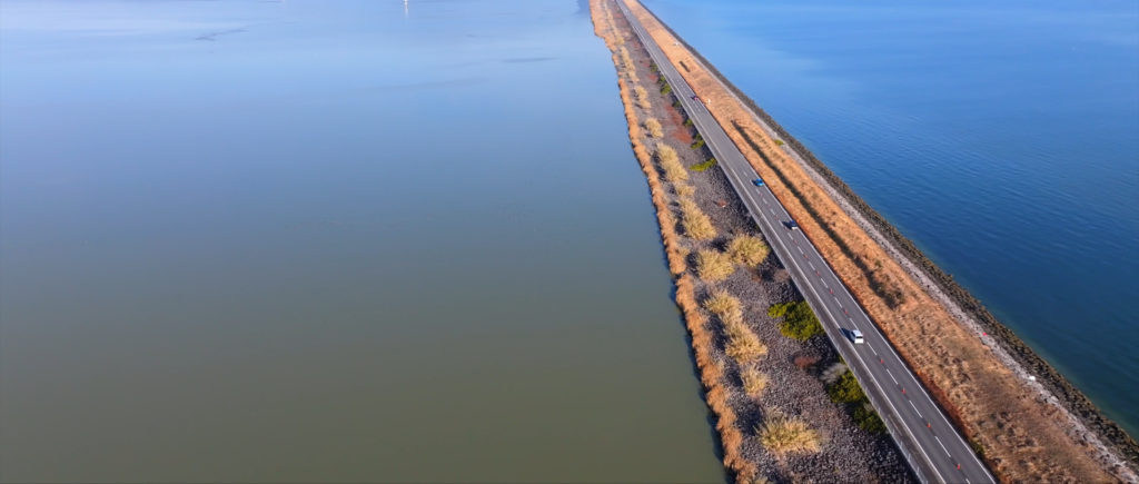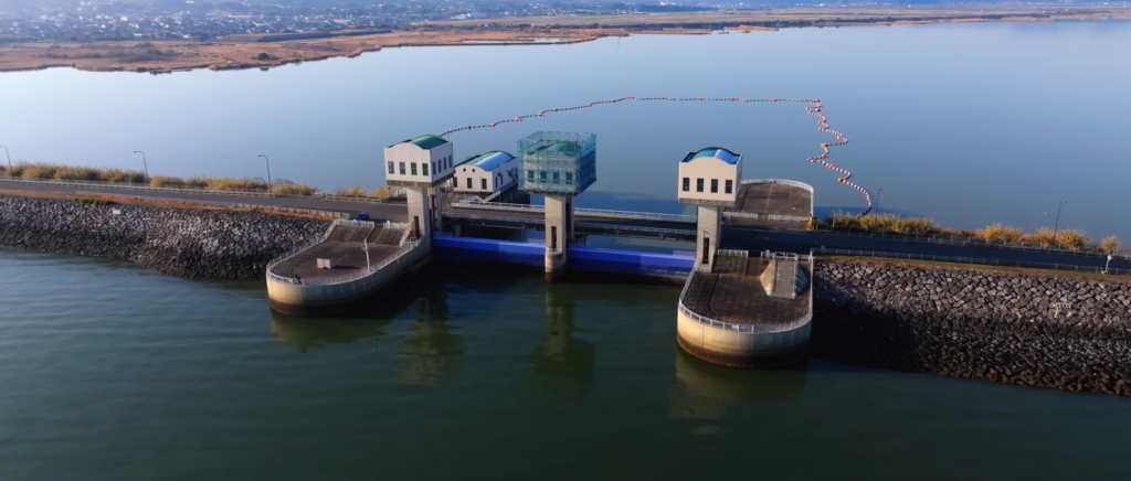 この堤防道路は諫早湾を横断するように一直線に伸びていて、長崎県の中でもスケールの大きい景色を楽しめる場所で、地上から見ると広い海と道路が続くだけのように感じますが、ドローンで上空に上がると、その景色の構造がよく分かります。